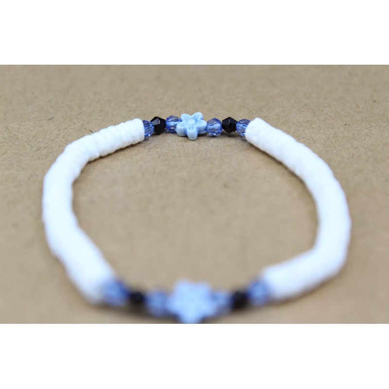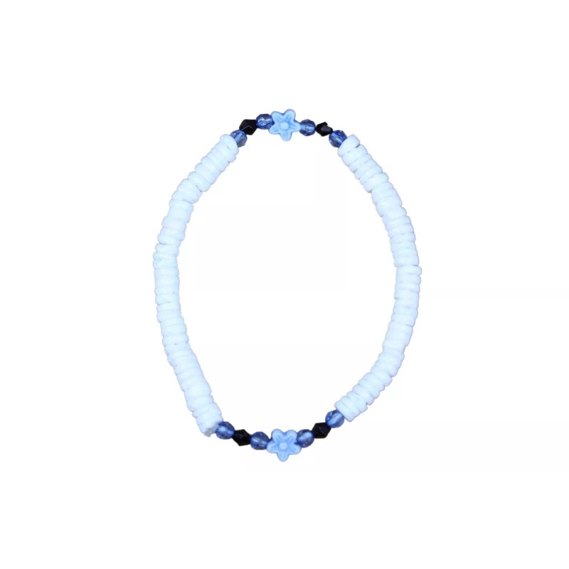 Handmade Puka Shell Bracelet w Blue Flowers - 7", White Smooth Seashell - Hawaiian Surfer