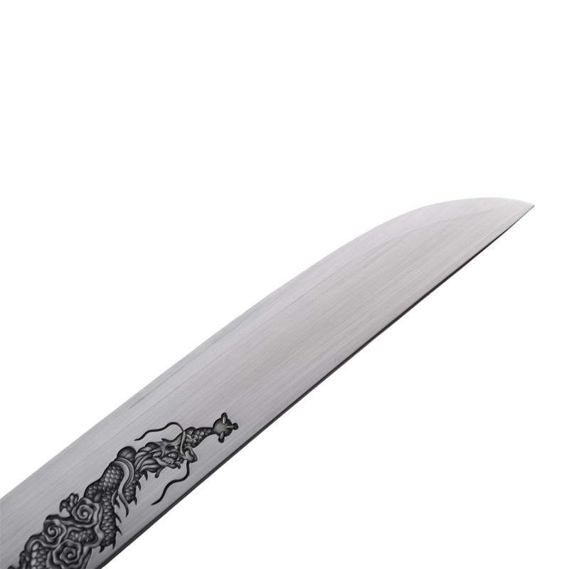 - Blade Material: Spring Steel (1065 Steel) Oil quenching - Hamon: No Hamon - Sharpness: Sharp - Tang: Full Tang - Blade colour :Blace baking process / Corrosion engraving