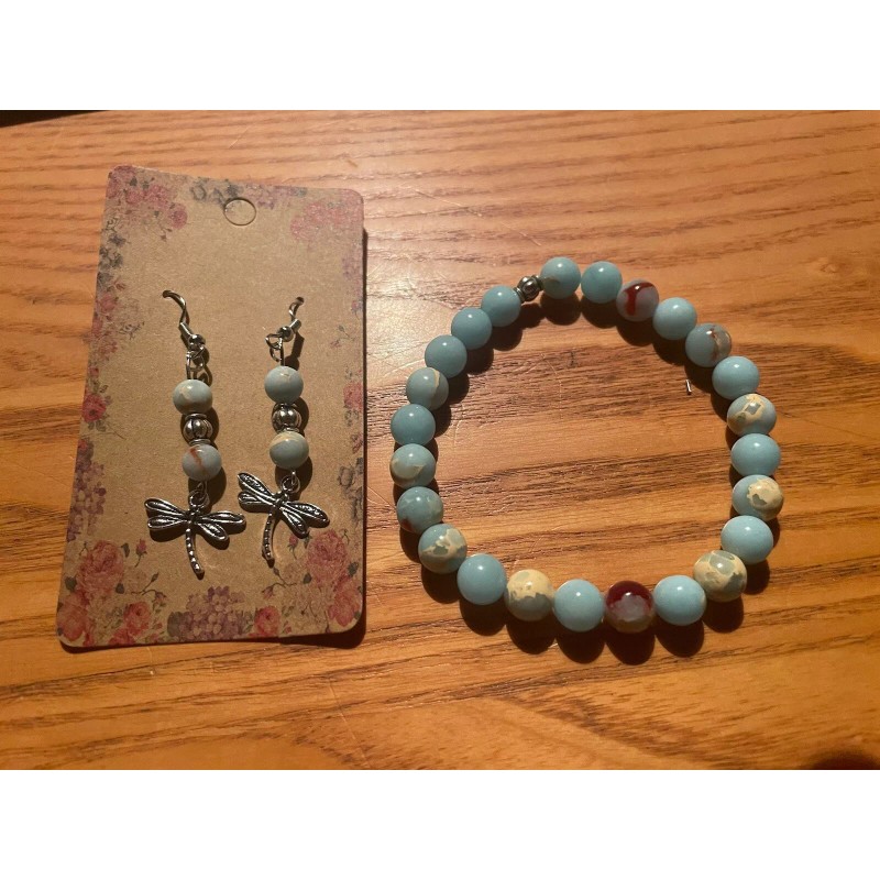 Natural Shoushan Stretch Bracelet & Earring With Silver Dragonfly Handmade by me.