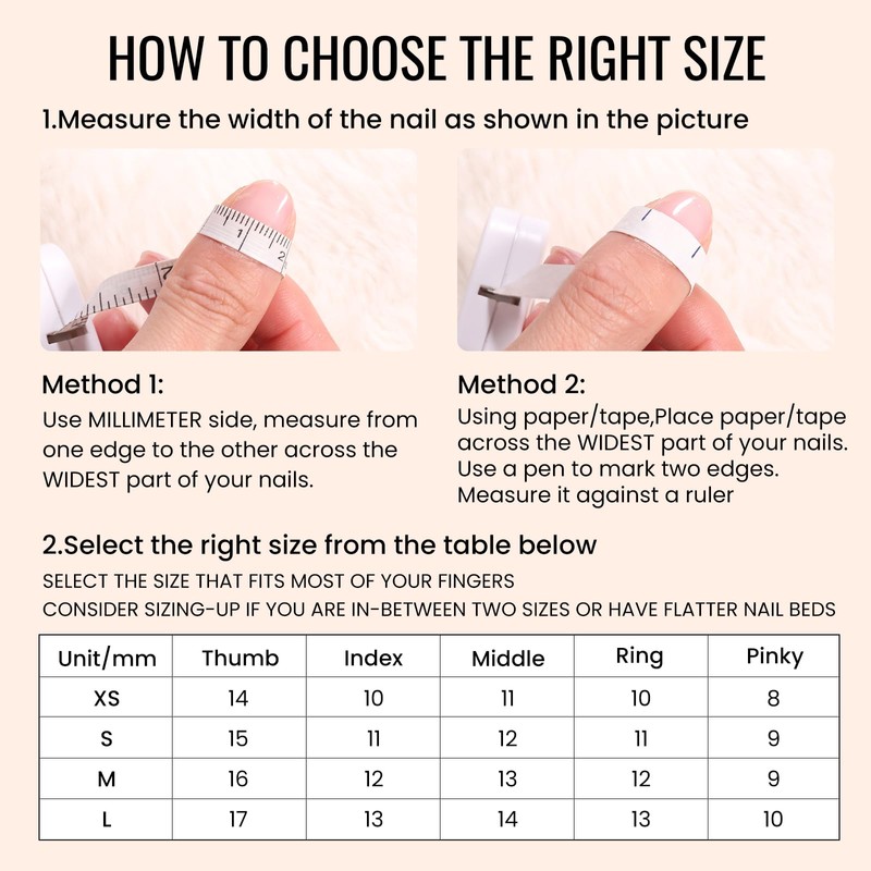 - Eco 4 Size to Choose :At GlimightyX, we know every nail is different—and wasting dozens of unused tips isn’t eco-friendly. That’s why we offer 4 curated size sets designed to fit most nail beds without the excess. Please refer to our size guide image to measure your nails accurately before ordering
