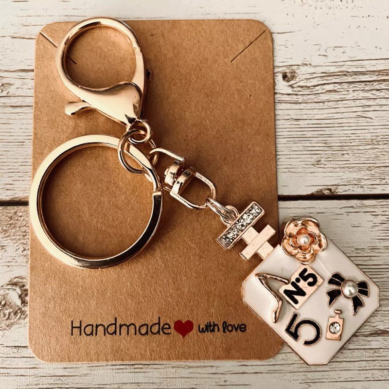 Handmade with Love Fine Perfume bottle Gold White Bling Metallic Lobster clasp Keyholder Keychain k