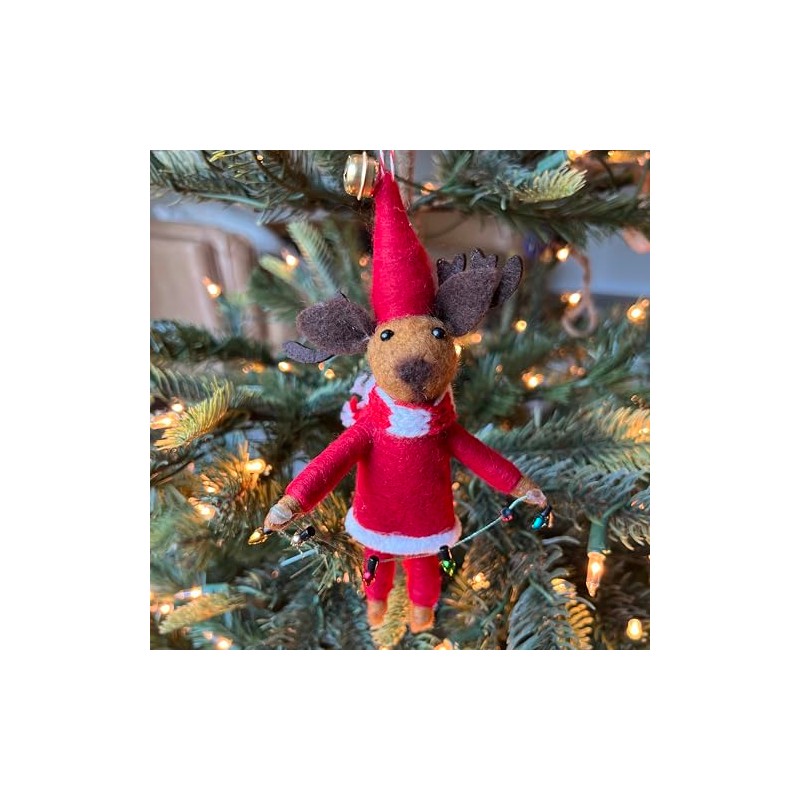 Handmade Wool Needle Felted Mr. Moose with Colorful Lights and a Jingle Bell on The hat | Christmas Tree Ornament