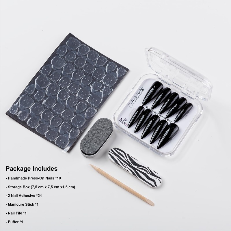 - 𝐖𝐡𝐚𝐭 𝐜𝐨𝐦𝐞𝐬 𝐰𝐢𝐭𝐡 𝐲𝐨𝐮𝐫 𝐩𝐫𝐞𝐬𝐬 𝐨𝐧 𝐧𝐚𝐢𝐥 𝐤𝐢𝐭? 10 nails of your selected style and set , 24 adhesive tabs x 2, Mini nail file , Manicure wooden stick , Puffer, A Storage Box