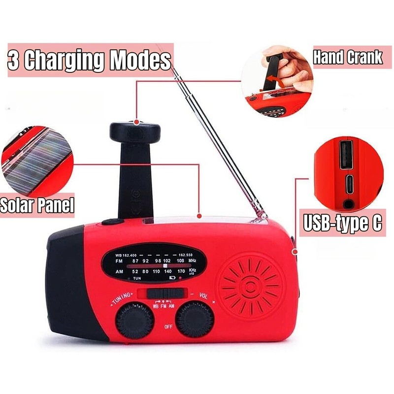 • 3 Rechargeable Ways : Type-C cable, Solar charging, Manual hand crank to wind up the internal battery. Power indicator ( 4 level lights ) shows the battery level.