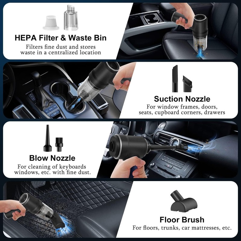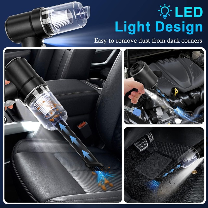 - 【Breiter Reinigungsbereich】Dieser kabellose Handstaubsauger hat 5 Düsen. Die kombinierten Düsen sind für die Reinigung von engen Ritzen und Ecken geeignet; die Bürstendüse wird für die Reinigung von Teppichen, Sofas, Autositzen und mehr verwendet. Die langen Düsen ermöglichen es Ihnen, den Reinigungsbereich zu erweitern - unter Tischen, unter Betten, im Kofferraum. Dieser Handstaubsauger für Autos ist mit einem hellen LED-Licht ausgestattet, das bei der Reinigung im Dunkeln und in Ecken hilft.