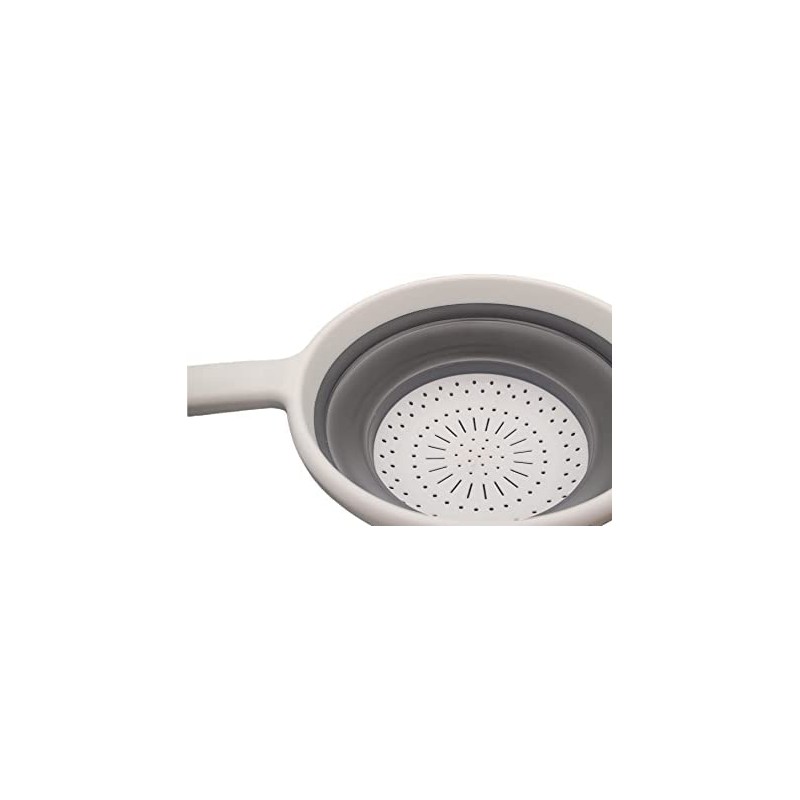 - The strainer is collapsible, so it doesn't take up room in your kitchen cupboards. The space saver collapsible colander is approximately 8" in diameter with a 5" handle and is 1.25" tall in size when collapsed. Expands to 3.5" tall when fully expanded.