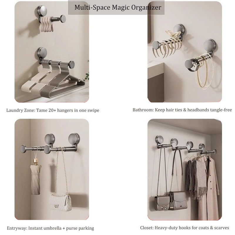 This closet acrobat whirls into action like a ballerina—sticks in seconds and spins to greet your hangers! Its flexible arms stretch to hug 10-20 outfits, while a bodyguard-strong grip (5KG!) keeps chaos at bay. Gentle as a yoga mat on walls, it moonlights in bathrooms, closets, entryways—a world traveler for your home’s messiest corners. Let it pirouette your clutter into calm! Perfect for renters, busy families, and hangers space-saving needs!