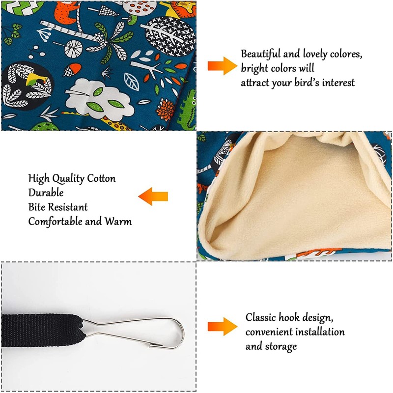 - Warm and cozy: our bird beds are made of high-quality cotton and the plush design makes the nest warmer to protect your parrot or bird from the cold in winter. And the bright colours will attract your bird's attention and interest.