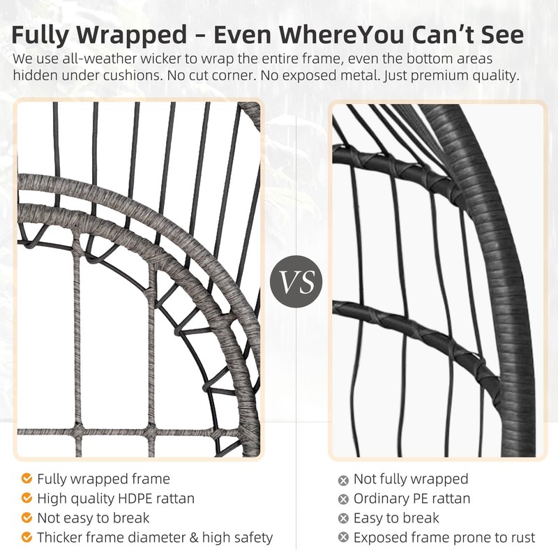 • 【Space-Saving Foldable Design】Crafted with high-density polyethylene (HDPE) rattan, this egg chair offers superior weather resistance and durability. The innovative foldable design allows for effortless storage when not in use, making it a practical addition to any space. Whether placed indoors or outdoors, this chair combines convenience with a sleek aesthetic.