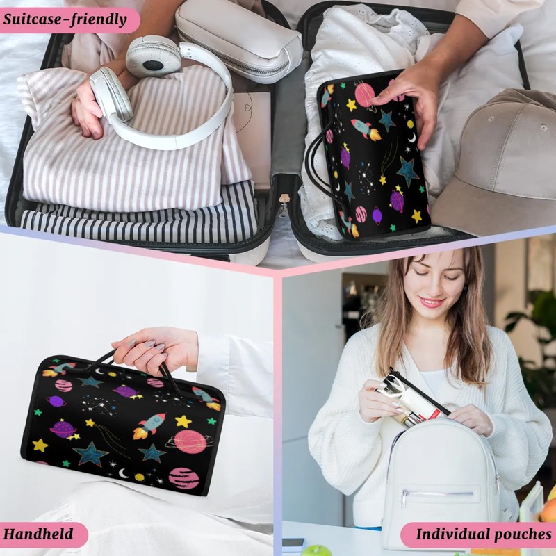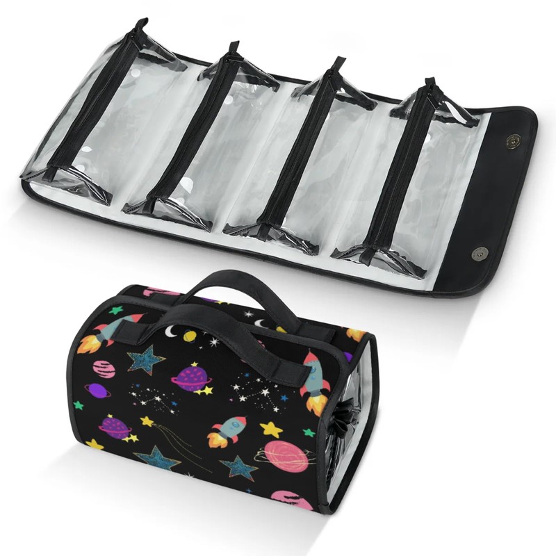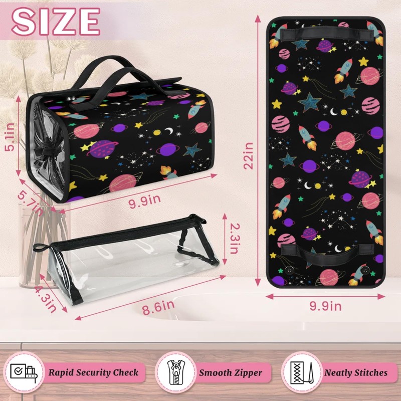 Hanging Roll Up Cosmetic Bag, Foldable Makeup Bag for Women, Space Planet Rocket Travel Toiletry Bag with 4 Removable Compartments, Suitable for Storing Cosmetics, Personal Care Products, Toiletries