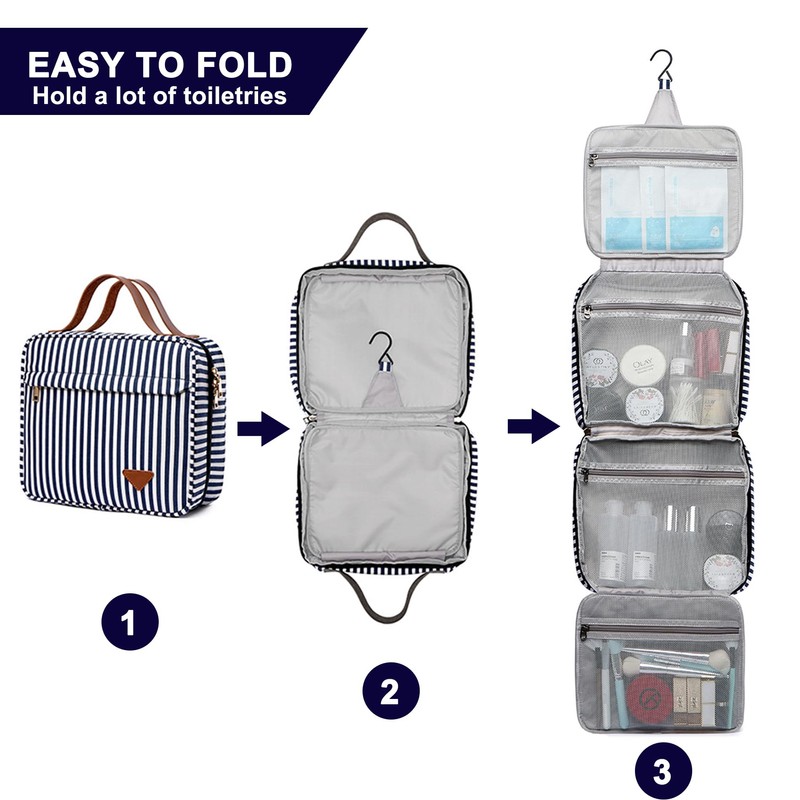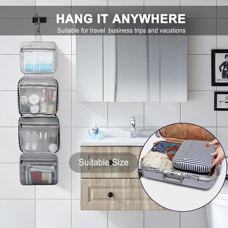 The durable hook allow for securely hanging the toiletry kit on everywhere(bathroom door),easy to view and access stored things.