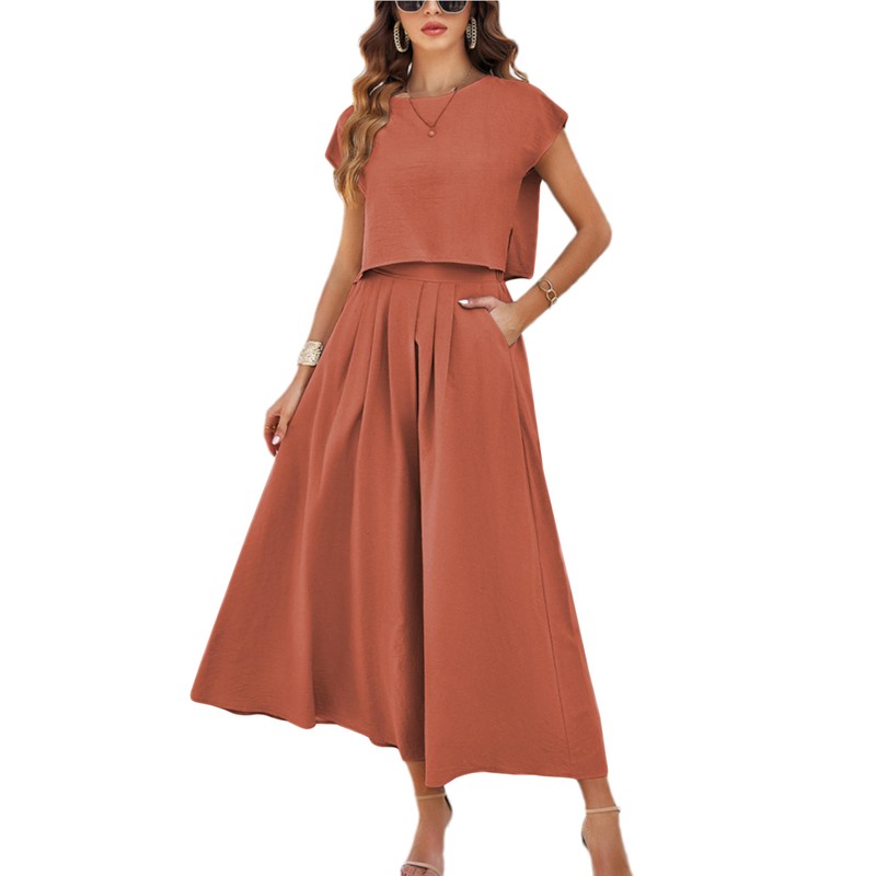 HangNiFang Summer Skirt Sets Women 2 Piece Outfits Cap Sleeve Top Elastic Waist Maxi Dress Sets with Pockets(1218-Rust-XL)