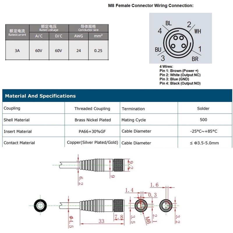 - M8 pico A coding aviation circular connector 4 pin female, secure solid and durable connection, gold plated contact. IP67 protection, vibration-proof.