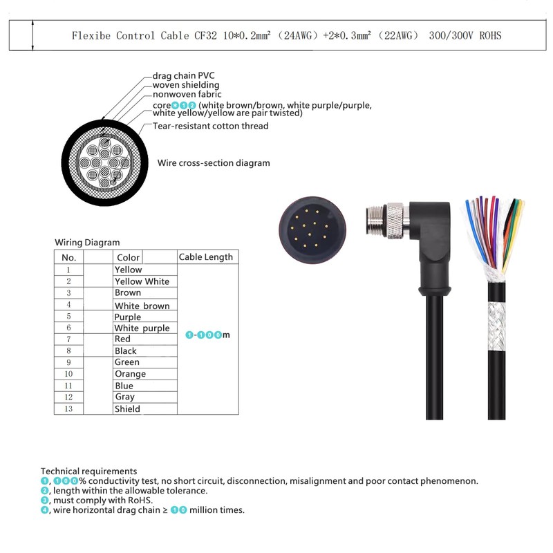 • The cable has an M12 A-coded 12-pin angled connector on one end and a 12-core bare wire (also called pigtail) on the other end. Gold-plated contacts, nickel-plated brass housing, waterproof, solid, reliable and durable connection. Plug with thread locking, anti-vibration, easy quick connection and disconnection