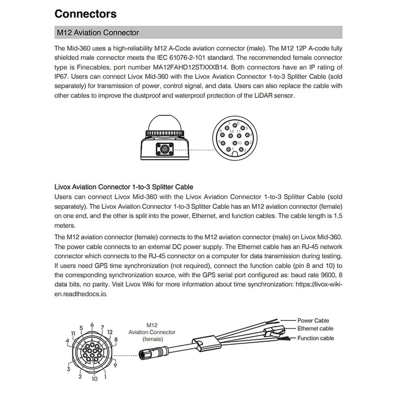- M12 aviation connector cable for power, Ethernet, and functional data, for quick debugging and verification of Livox products. 1 meter / 3.28 ft