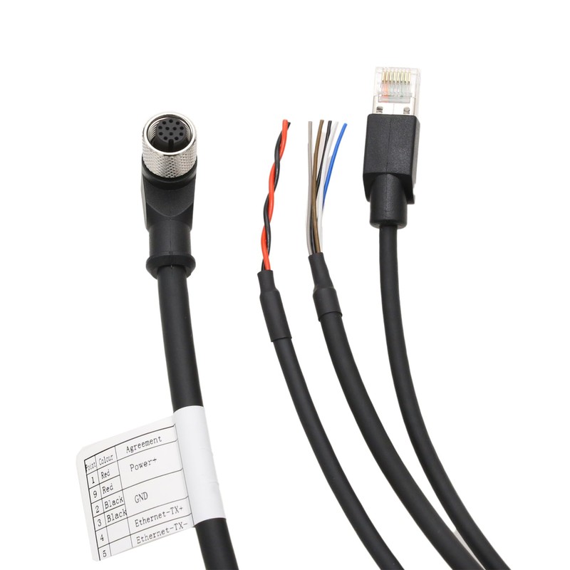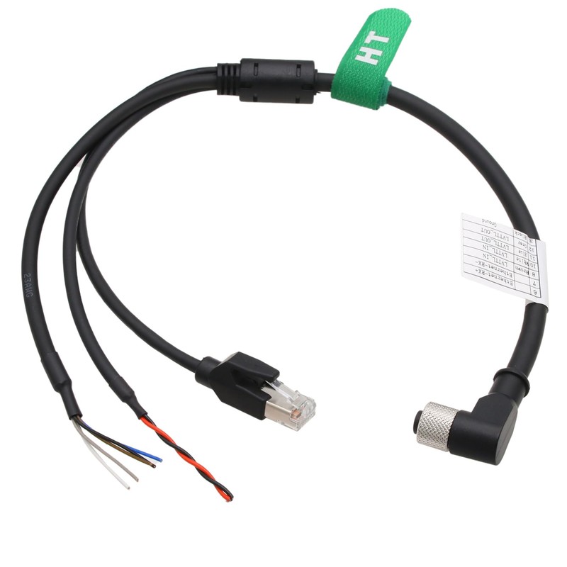 - M12 12-pin A-code female right-angle connector to RJ45 Ethernet network cable, 2-wire power cable, 5-wire function cable. Gold-plated contacts, nickel plated brass shell, waterproof, solid and durable connection