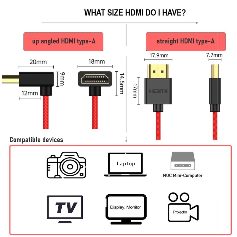 - [Connectors] Standard HDMI 2.1 Type A full size at both ends, straight up angled L-shape, compatible with HDMI 2.0 and HDMI 1.4. Lossless and stable HDR, 3D, audio, video and Ethernet signal transmission