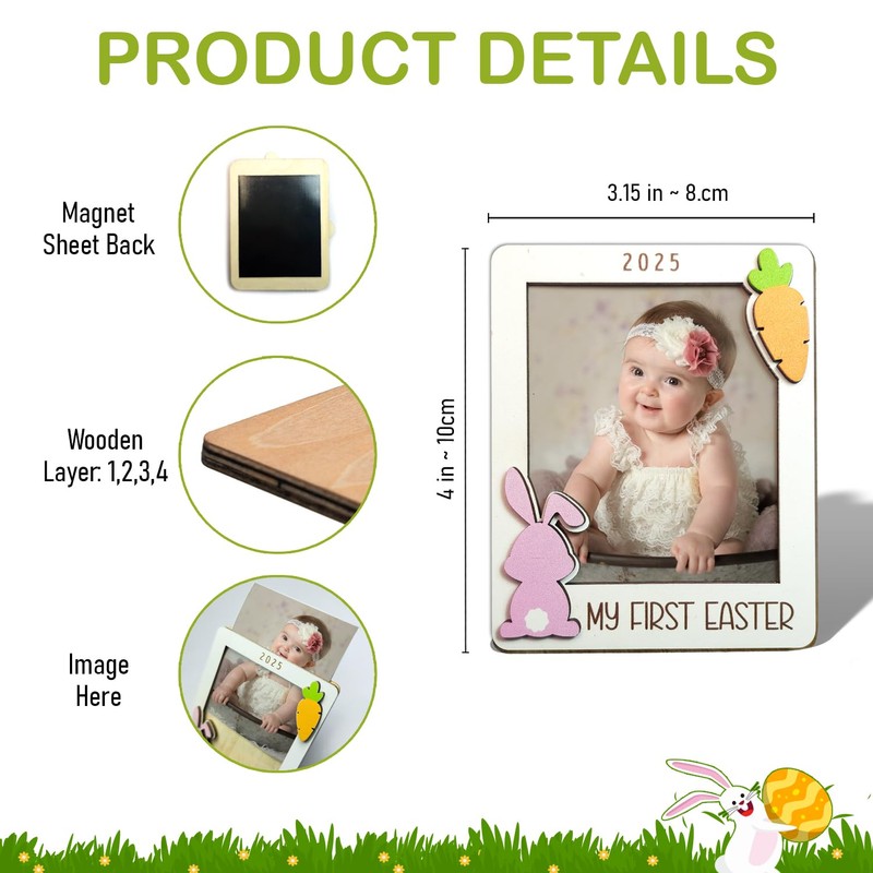 - Strong Magnetic Backing – Designed with a durable magnet sheet, this baby’s 1st Easter frame easily attaches to refrigerators, lockers, or any magnetic surface, making it a charming Easter decoration.