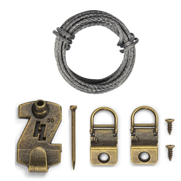The HangZ 1-Hole D-Ring Kit contains everything you need to hang a canvas or open backed frame. The HangZ 1-Hole D-Ring Picture Hanger is the only D-Ring to be completely hidden. No exposed hardware and the picture will never lean off the wall! Each set holds up to 25 pounds. Antique Brass Finish for decorative look. Kit includes two 1-Hole D-Ring Picture Hangers, 9-foot long coated picture wire (made to be cut to desired length), one HangZ Gallery Picture Hook, and mounting hardware. One piece Zinc Alloy construction make HangZ the world's strongest picture hook. No studs or anchors needed to mount the HangZ Gallery Picture Hook.