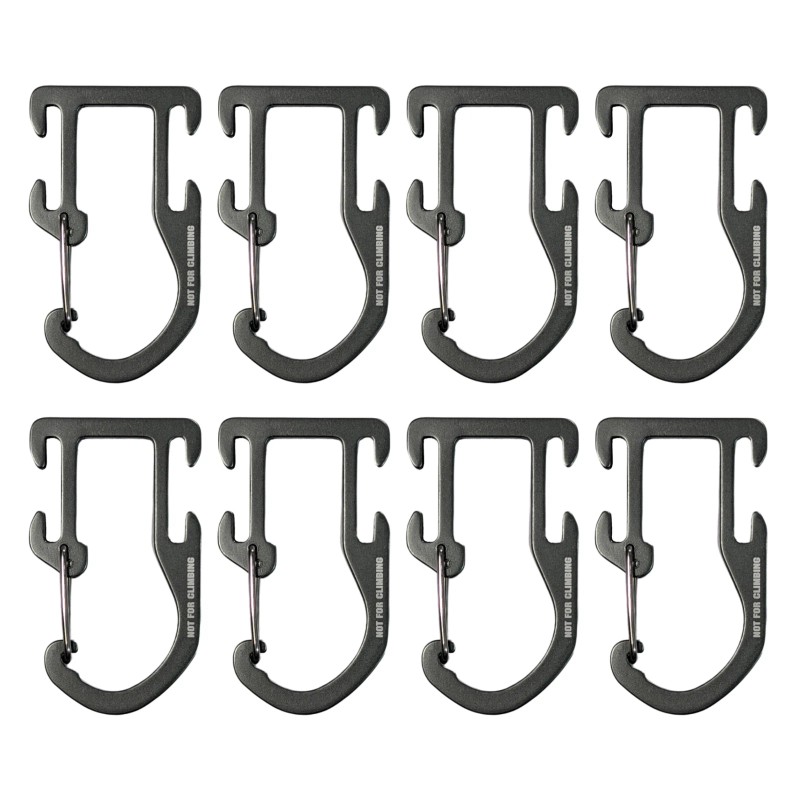 Quick Attach 1" Gear Snap Clip for Backpacks and Vests. Qty: 8-Pack Color: Dark Grey Material: Aluminum Compatible with 1" molle webbing. Dimensions: 2.89 " L x 1.67 " W x 0.11" Height. Weight: 10 grams Using our MOLLE D-ring snap hook for attaching gear offers several benefits, especially in tactical, military, outdoor, and recreational activities. Here are some key advantages:
