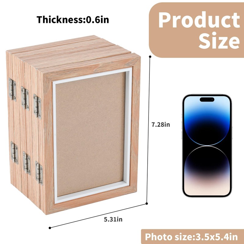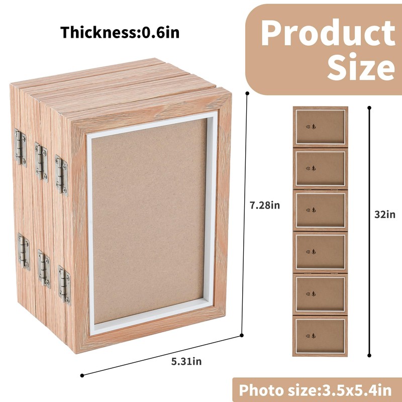 - 6 Hinge Photo Frames: Folded into 6 pieces, each size is 7.8"x5.9 ", suitable for 5 "x 7" photos. With 6 photo frames, you can store a lot of precious memories. However, if you don't want to show it too much, you can separate it.