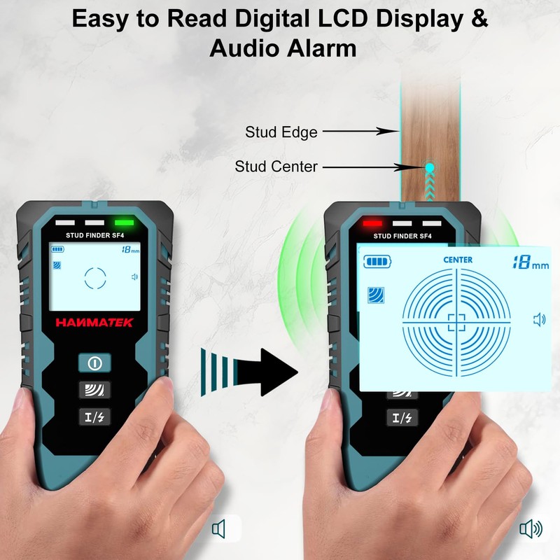 - High Visibility LCD Display: Equipped with a bright backlit LCD display, this stud scanner shows the center, edge, and location of detected studs, along with battery status. Audio alerts and beep sound guide you to the exact stud location, even in low-light settings.