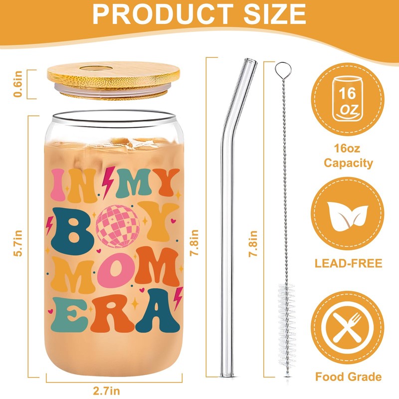 - 【Premium Glass Cup for Boy Mom】Measuring 3"Wx6"H, this 16 oz glass cup is made of thicker glass, crystal-clear. It also includes a bamboo lid and reusable straw, making it portable. Boys never seem to run out of energy, which can be challenging for any new moms. With our Boy Mom glass, she can enjoy a relaxing moment with her favorite drink after the kids go to bed