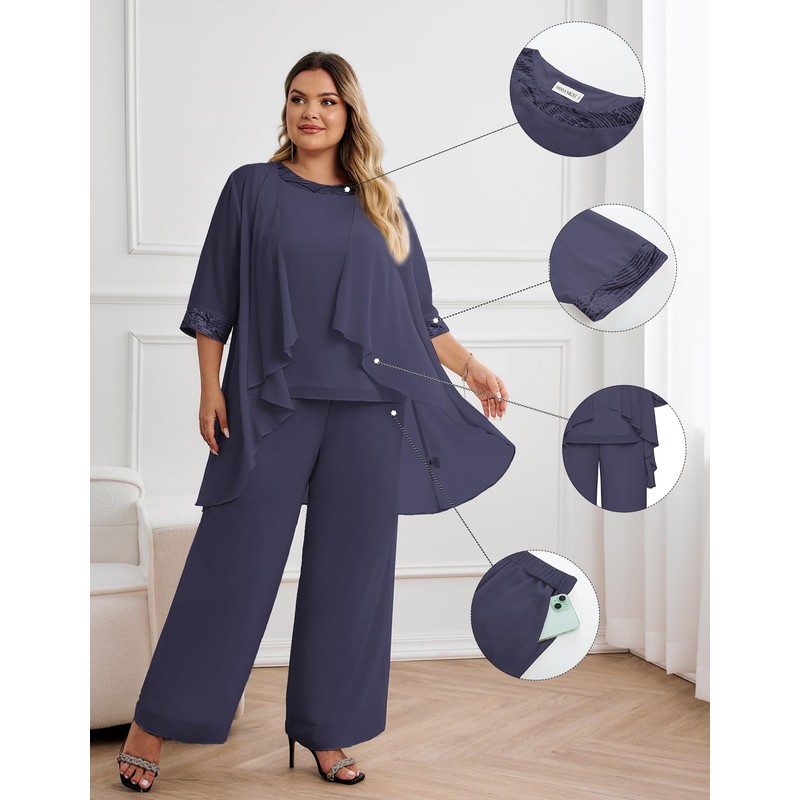 - Plus Size 3 Piece Pant Suits: Elegant mother of the bride pants suit features in sequined neck, wide leg pants with pockets and 3/4 sleeve chiffon long cardigan hiding the imperfection yet still flowy and beautiful.
