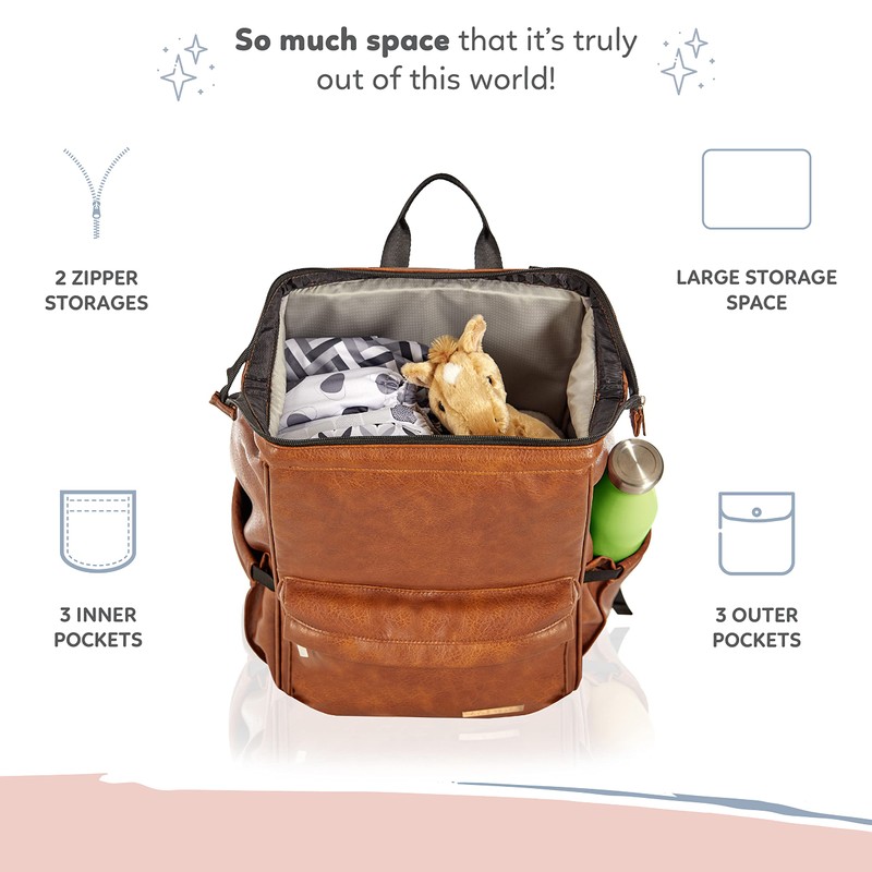 - FASHIONABLY ADVENTURE-READY: This comfortable Diaper Backpack comes with easy-to-hook stroller straps. It’s available in a warm & stylish, non-toxic Cognac Brown color.