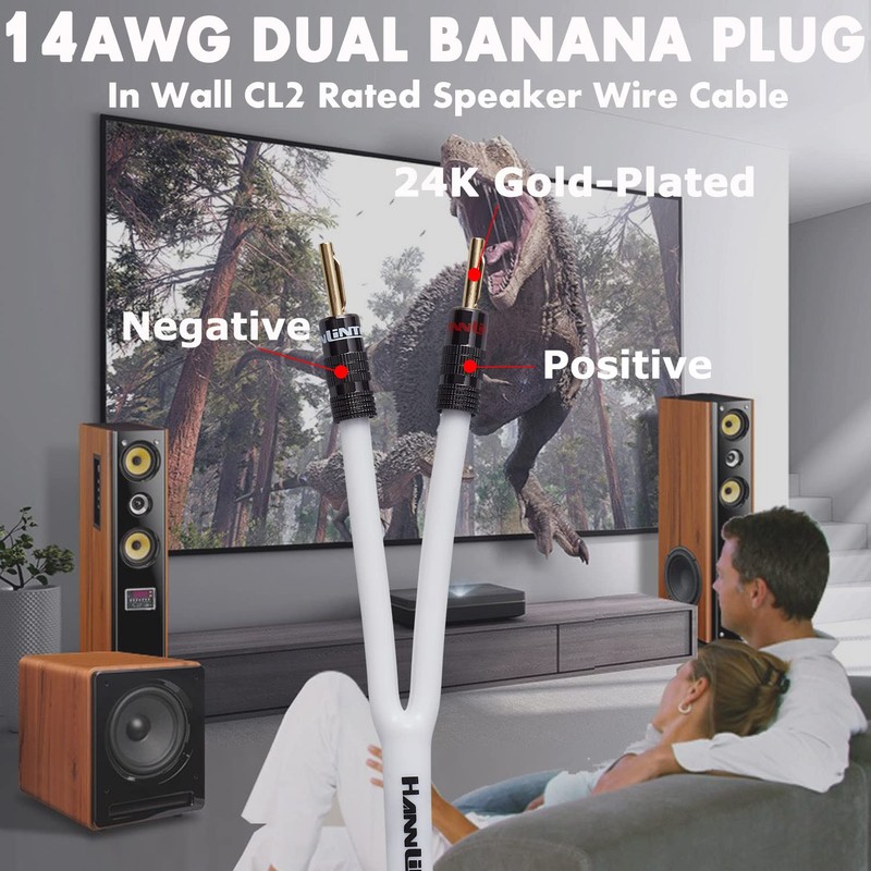 - 【HannLinte 14AWG Speaker Cable】- Our banana plug speaker cable is made from pure oxygen-free copper (OFC) speaker wire with banana plug. High quality and in wall CL2 rated premium banana plug wire designed for home stereo, center channel speakers, subwoofer, and sound systems.