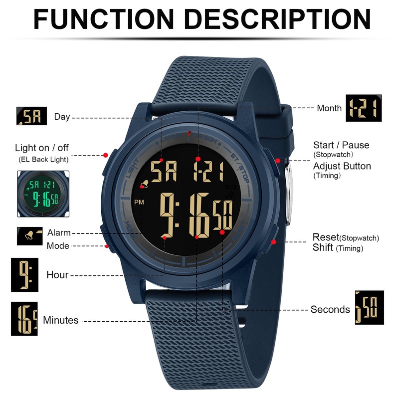- Men's digital watches: the digital watch is equipped with high-quality analogue quartz movement and battery with multifunctional: 12/24 hour switch, date display, automatic calendar, alarm clock, hourly ring reminder.
