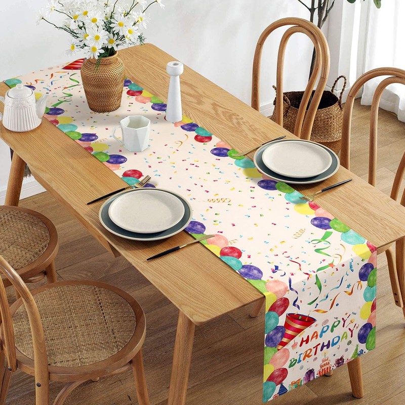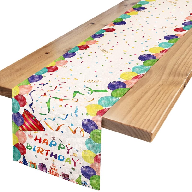 - STYLISH DESIGN This cheerful birthday table runner is decorated with cheerful elements. Colorful, flashing pieces, exciting cheerful balloons and ribbons, golden small dots, birthday cake, all these elements create a cheerful and pleasant atmosphere that attracts your guests to join and enjoy your party.