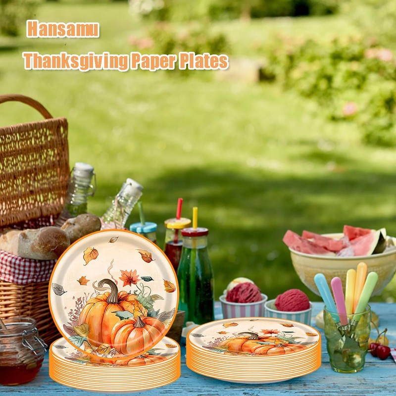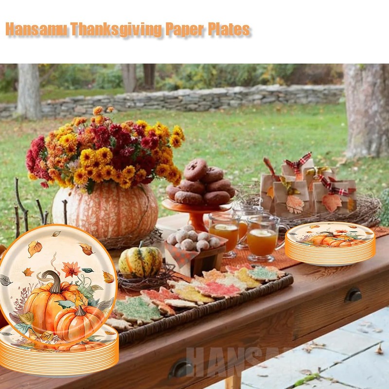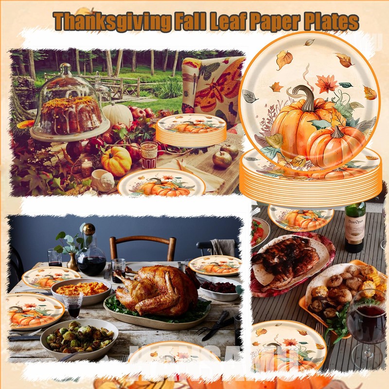 - Celebrate Thanksgiving with our 24 Pcs Fall Paper Plates, featuring vibrant pumpkin and maple leaf designs perfect for any festive gathering.
