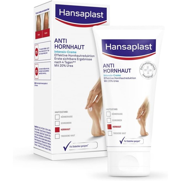 The Hansaplast Anti Callus Intensive Cream with 20% urea was specially developed for feet that are prone to calluses. The foot cream offers an effective formula with a callus-reducing urea concentration. The foot care cream provides the skin with intensive moisture and increases its ability to bind it. The use of the anti-callus cream leads to a significant improvement in the condition of the skin. Thanks to the intensive formula with urea, feet become visibly softer and more supple - after just 4 days of use.*