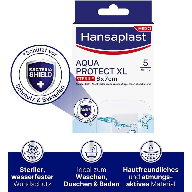 - Box contents & details: Hansaplast Aqua Protect XL, size 6 x 7 cm, 5 wound plasters, skin-friendly waterproof plaster set + 1 free eraser from ManyMore Onlinehandel