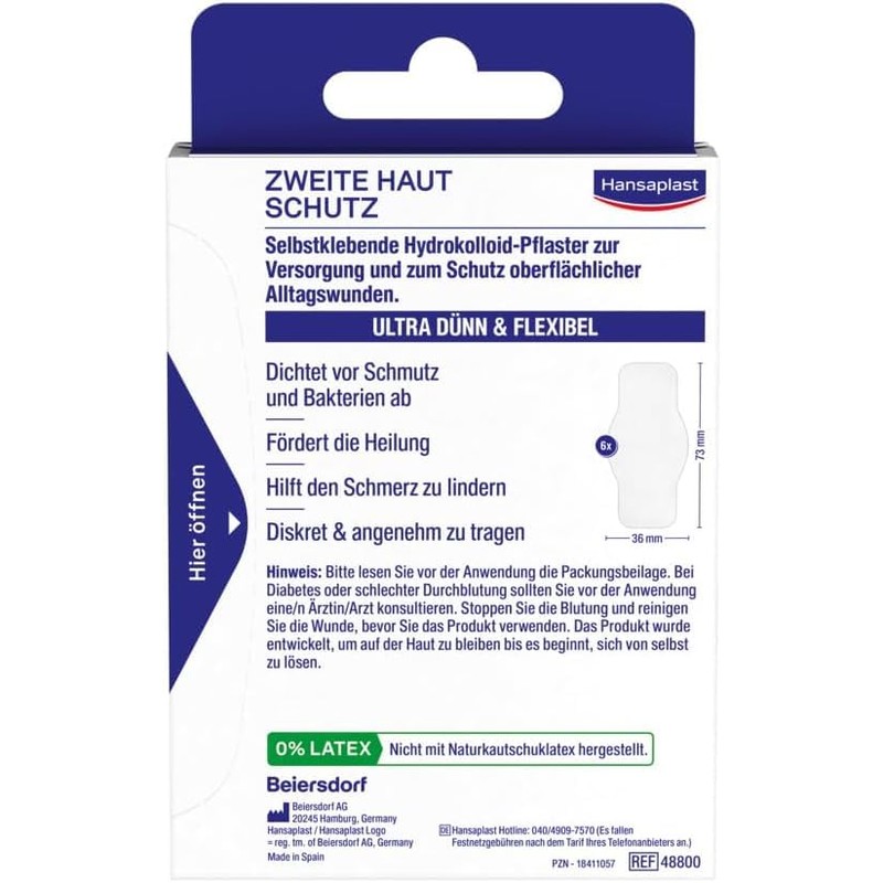 • Box contents & details: Hansaplast hydrocolloid plasters second skin protection, 6 plasters (7.6 x 3.5 cm), ultra thin and waterproof