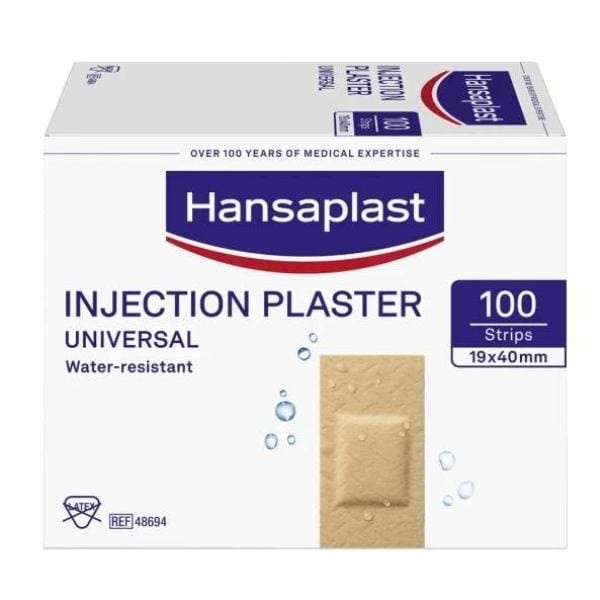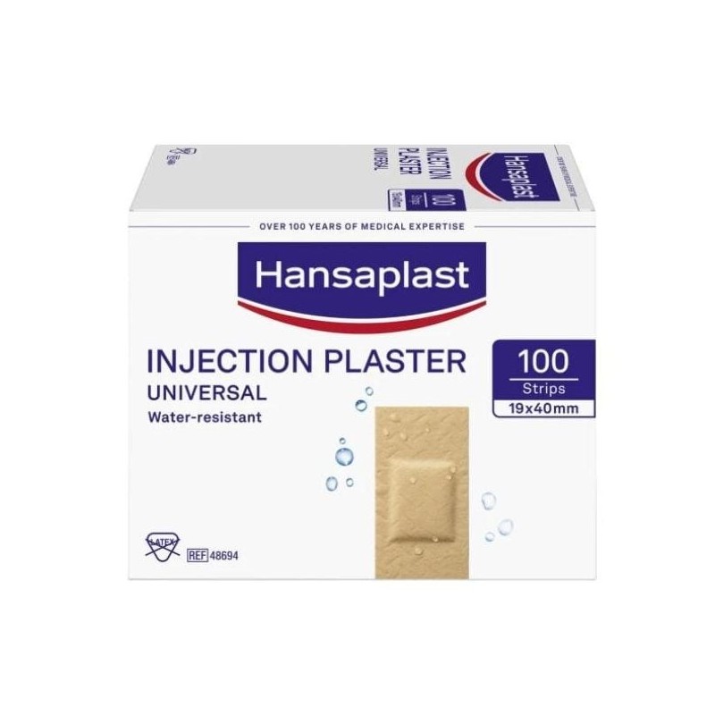 Hansaplast Universal Injection Plasters are self-adhesive plasters resistant to water. They are suitable after injections to cover all kinds of small wounds. It is made of material that allows the skin to breathe and repels water.