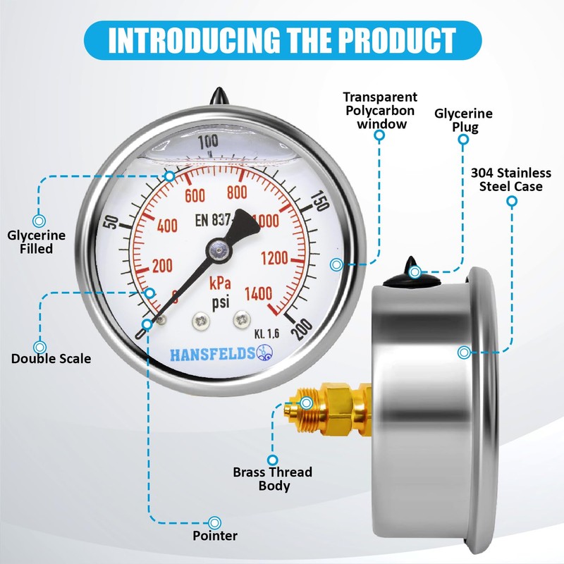 - ✅ Key Features: ✔ Measurement Range: 0 to 200 PSI, suitable for medium-pressure systems. ✔ Liquid Filled: Glycerin-filled to minimize vibrations and improve longevity. ✔ 2.5" (63mm) Dial Face: Large, clear, and easy-to-read display. ✔ 1/4" NPT Back Mount: Compatible with standard NPT installations. ✔ Stainless Steel Case: Corrosion-resistant and durable for harsh environments. ✔ Accuracy 1.6: High precision for accurate pressure measurements.