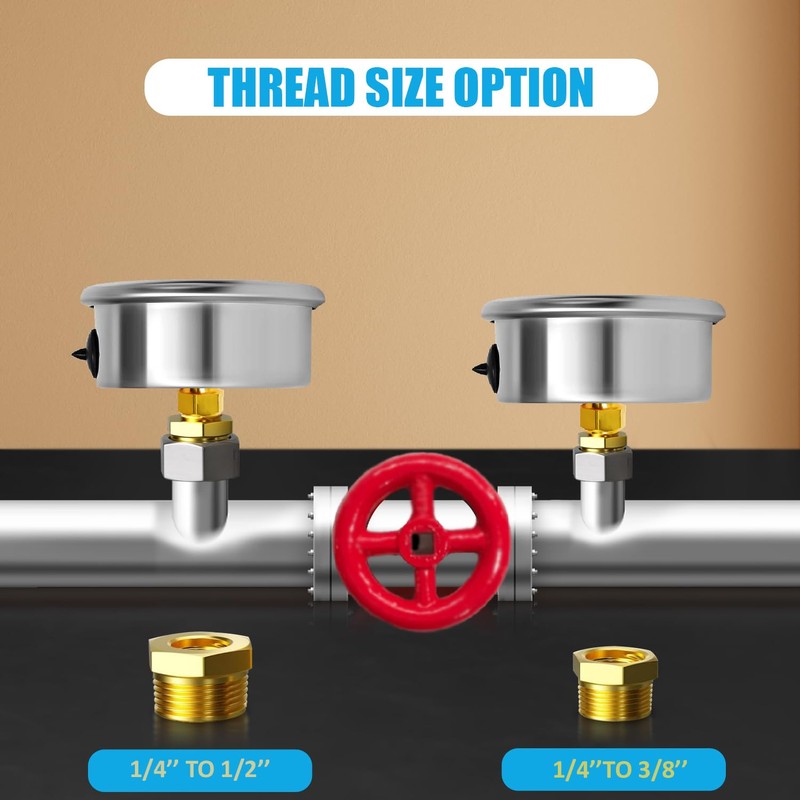 - 📏 Universal Fit – 1/4" NPT Back Mount Includes 1/4" NPT back mount for easy vertical installation, plus 1/4" × 1/2" and 1/4" × 3/8" NPT hex reducers for flexible fitment in various systems.