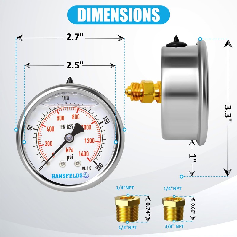 - 📦 Package Includes: 1 x Hansfelds 0-200 PSI Pressure Gauge 1 x 1/4" x 1/2" NPT Hex Reducer 1 x 1/4" x 3/8" NPT Hex Reducer 🛠️ Durable and Reliable for In