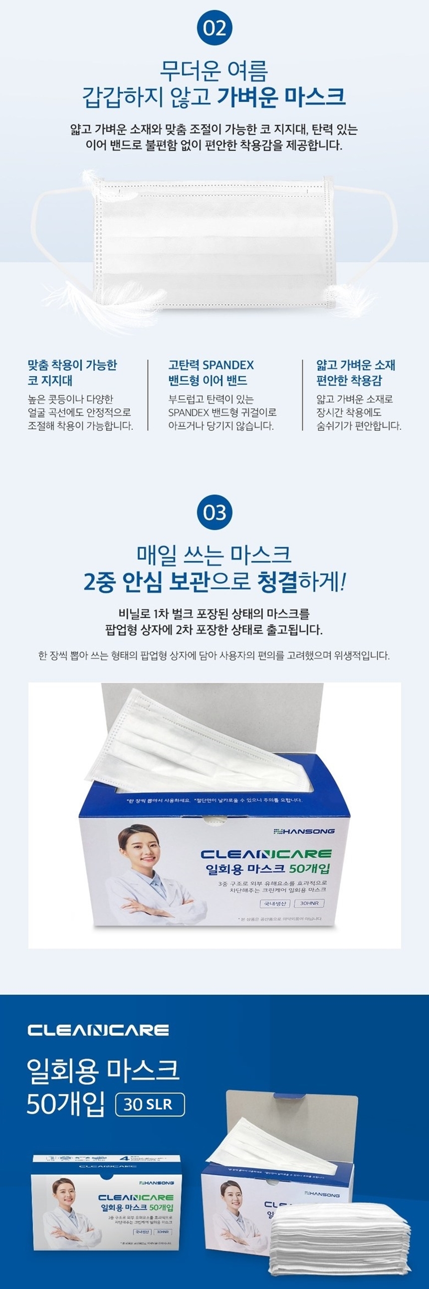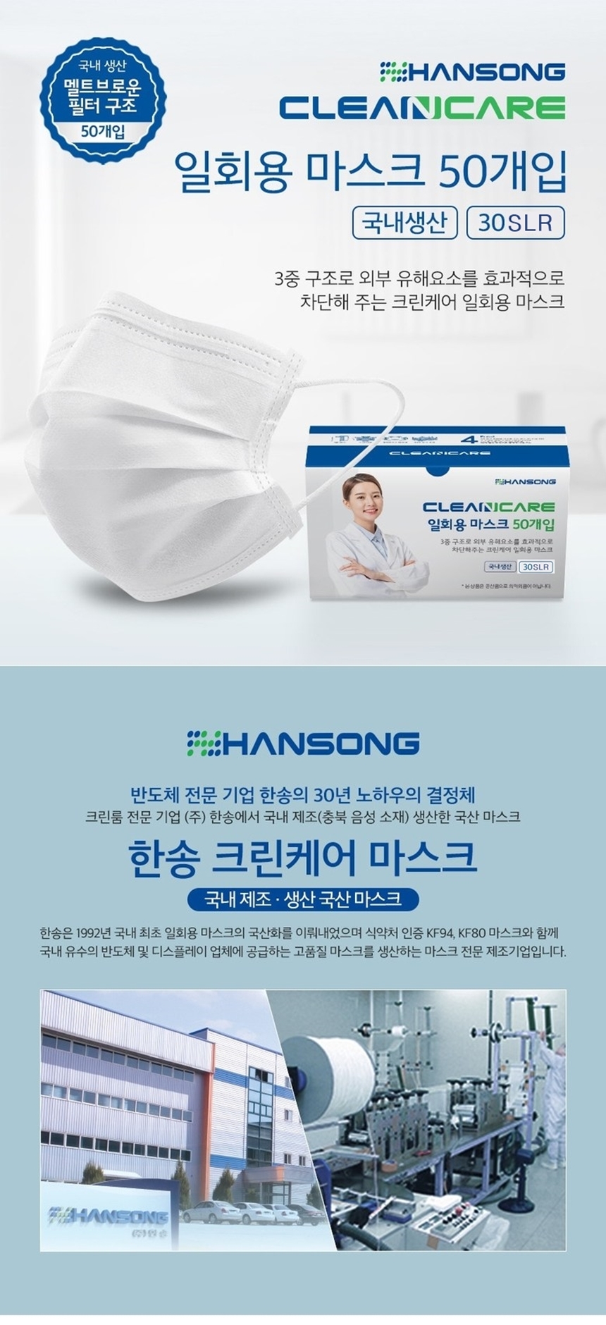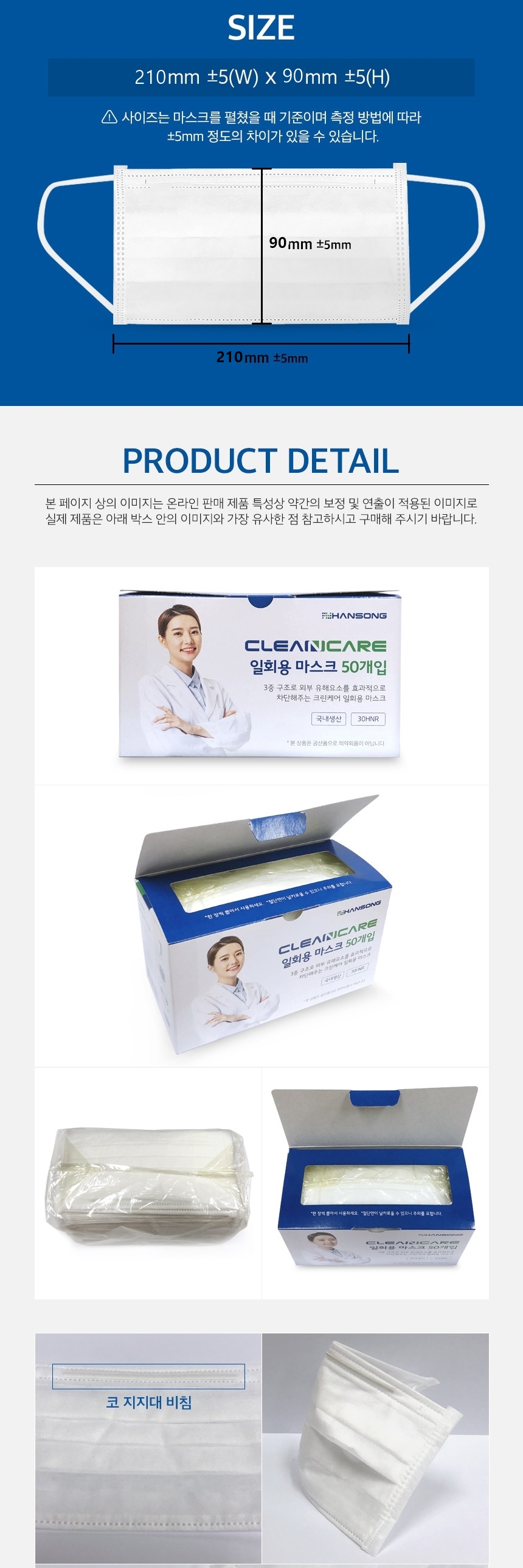 Hansong Clean Care Extra Large Disposable Mask 50 Sheets Width 210mm Extra Large Simple Big Size / 한송 크린케어 특대형 일회용 마스크 50매 가로 210mm 초대형 얼큰이 빅사이즈