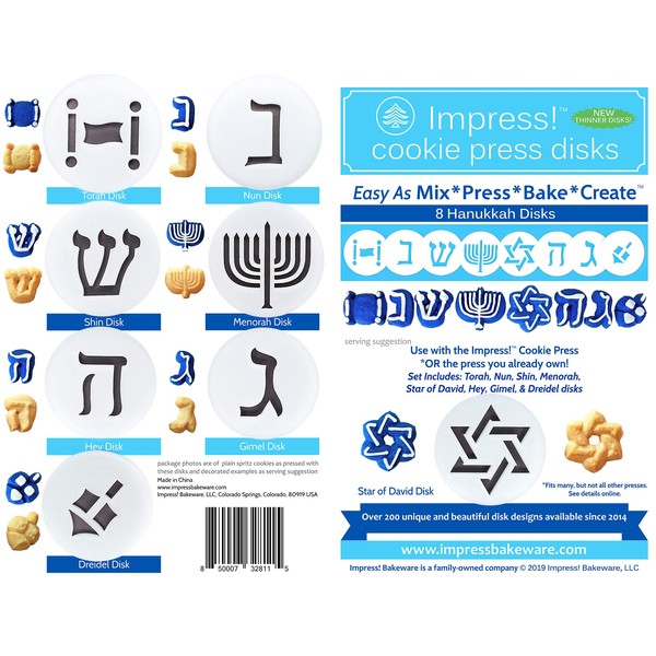 - 8 COOKIE PRESS DISKS IN 8 FUN DESIGNS: Star of David, Torah, Nun, Shin, Menorah, Hey, Gimel and Dreidel.