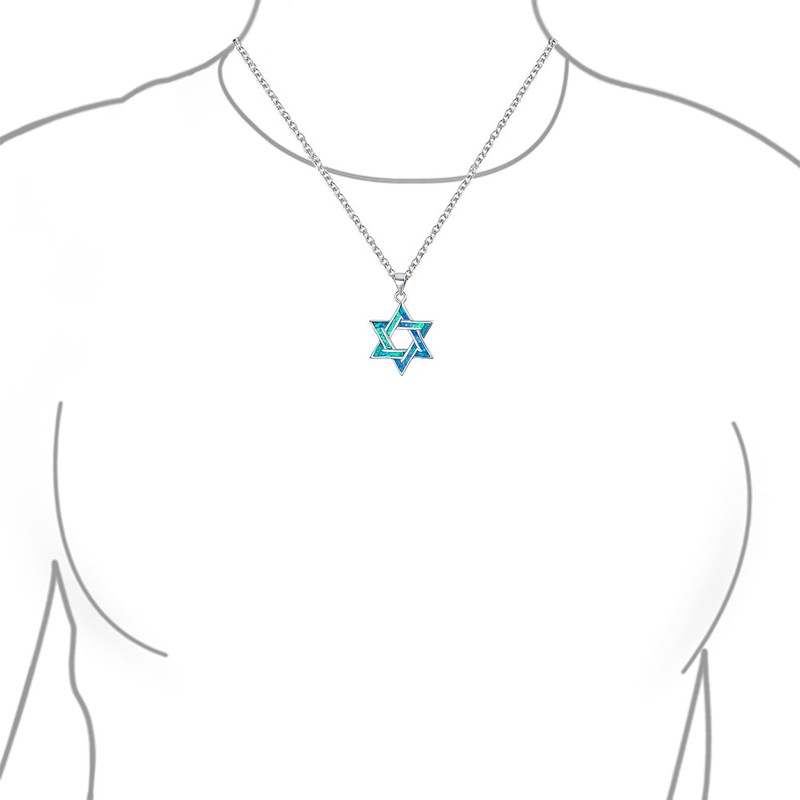 - Celebrate your faith or heritage with our exquisite opal gemstone Star Of David necklace, perfect for October Birthstone celebrations, Bat Mitzvahs, Passover, or Hanukkah gifts. Our stunning Created Blue Opal Star of David pendant beautifully combines the classic hexagonal design with inlaid stones at each point, making it a standout piece in the realm of religious jewelry. Embrace tradition with a modern twist with this unique and meaningful accessory.