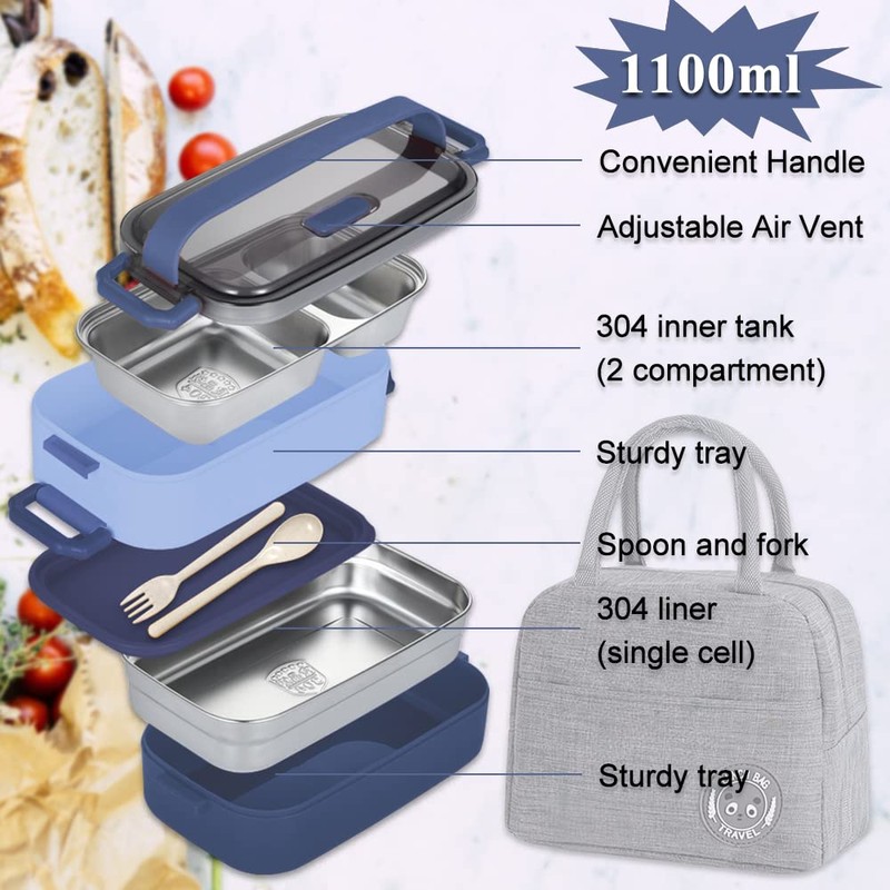 - Lunch box kit: the package includes: 1 x 1100 stainless steel lunch box, 1 x lunch bag. The Bento boxes are made of high-quality PP and 304 stainless steel, safe, no BPA, odourless. The Bento boxes come with a handle and 2 stainless steel containers in 500 ml and 600 ml, 3 compartments, keep your food clean and tidy without mixed flavours.