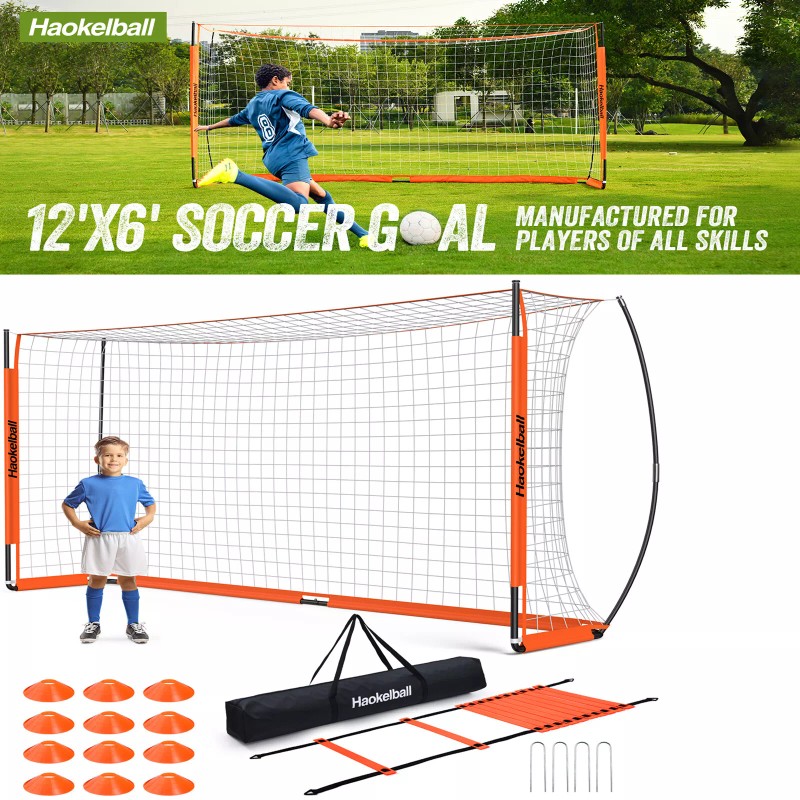 Haokelball Soccer Goal 12'x6' Portable Soccer Net with Frame Ladder & 12 Cones for Backyard