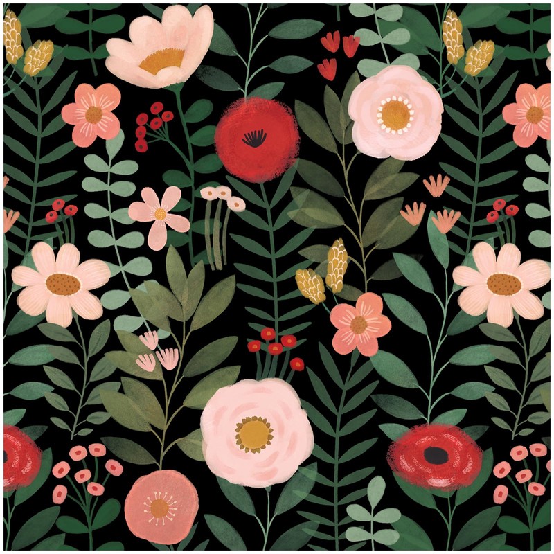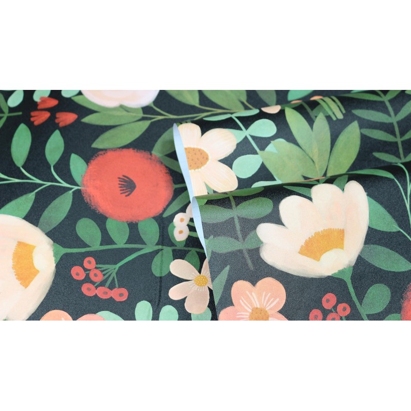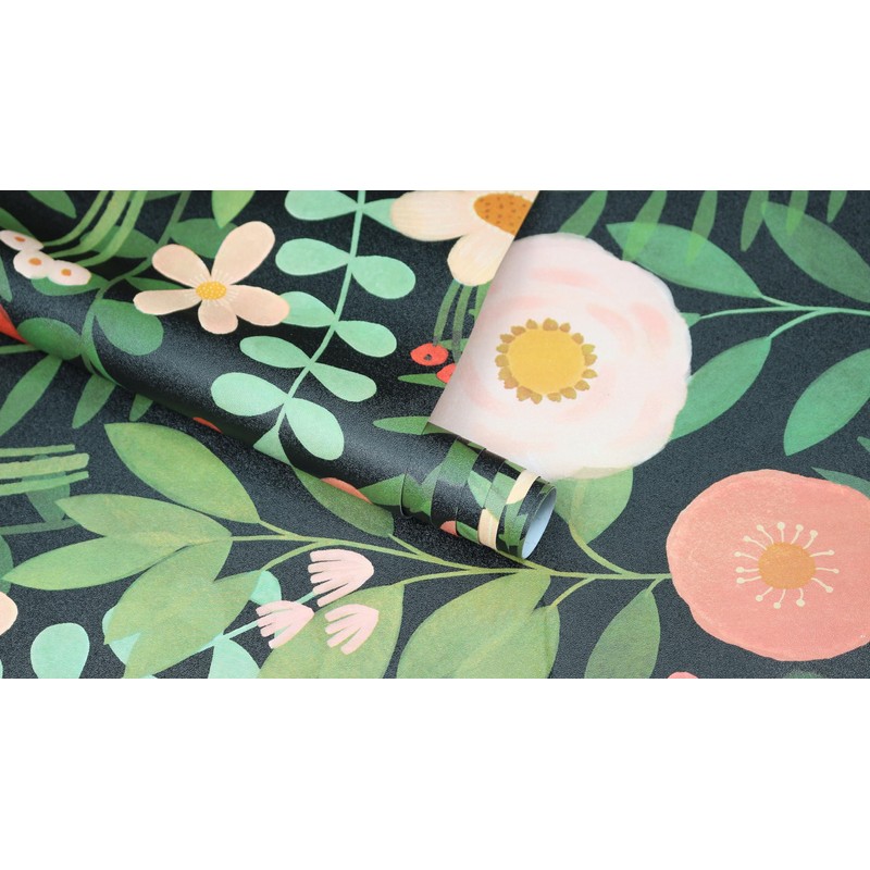 - PATTERN & DESIGN: This floral peel and stick wallpaper features an adorable modern cute design. Set against a black background, it depicts a forest scene filled with lovely flowers in various forms. The leaves are in different shades of green like oliva, sage green and turquoise, while the flowers come in soft pink, vivid red and bright yellow. This wallpaper is not only a decor piece, it's perfect for creating a dreamy place in girls' or nursery rooms.