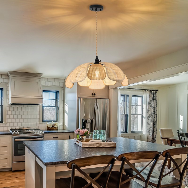 - 【BOHO Lotus Flower Design】 Boho lotus petals made of hand-woven natural rattan lampshade 20 inch,The lighting patterns projected on the ceiling or wall emits elegant light and very beautiful.The durable rattan pendant light creates a farmhouse,romantic bohemian decorate.