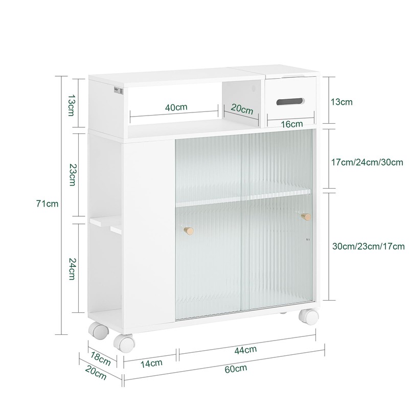 - [Structure of The Movable Narrow Toilet Side Cabinet]: The cabinet has large space for storage. Structural diversification, it has a lift-up top, a toilet roll holder is inside. There is a flat shelf next to it. There is a shelf inside the glass sliding door that can be adjusted to 2 heights. There is 1 brush shelf on the side. Equipped with 4 wheels (2 with brakes) for mobility.