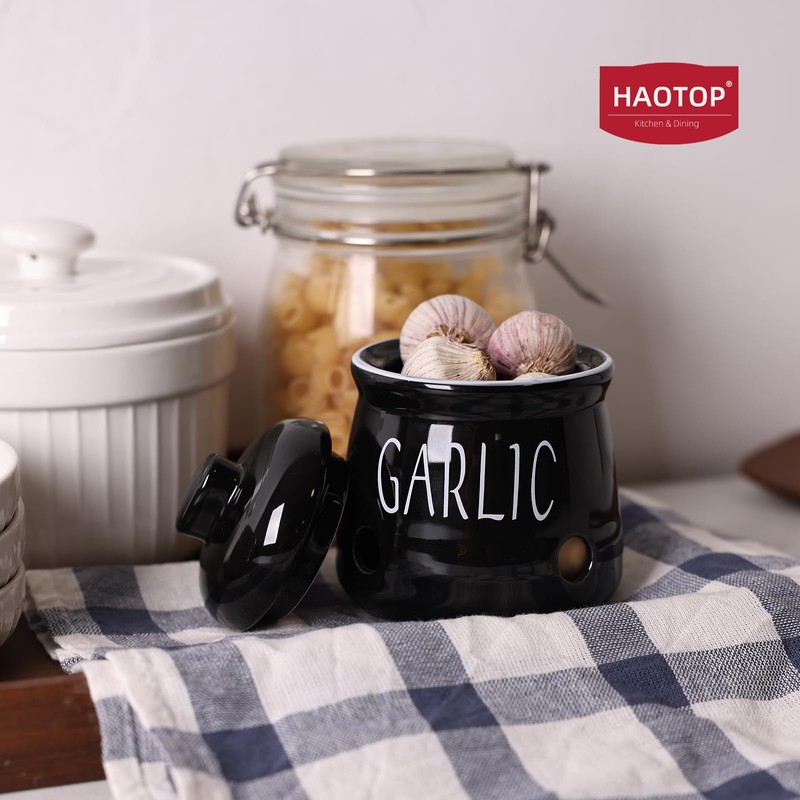 HAOTOP Ajo con tapa, mini contenedor de ajo de cerámica para encimera, mantiene tus dientes de ajo frescos, negro