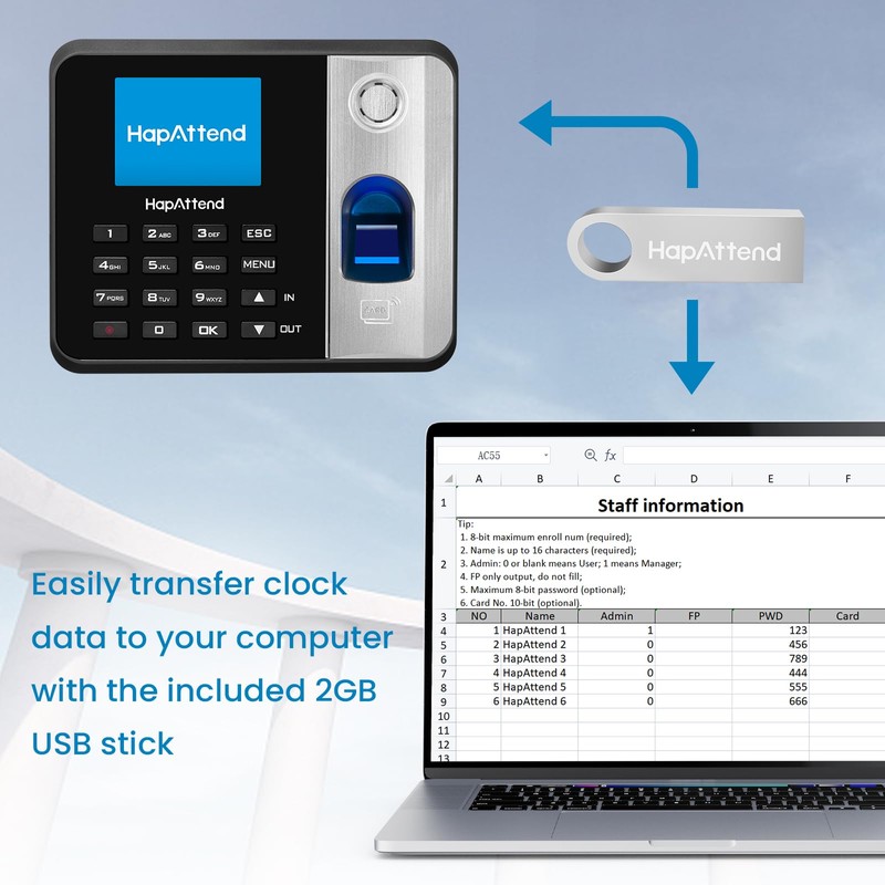 - Standalone Use: In order to protect data privacy, HapAttend clocking in machine prohibits internet connection, and data can be transmitted through USB flash drive.